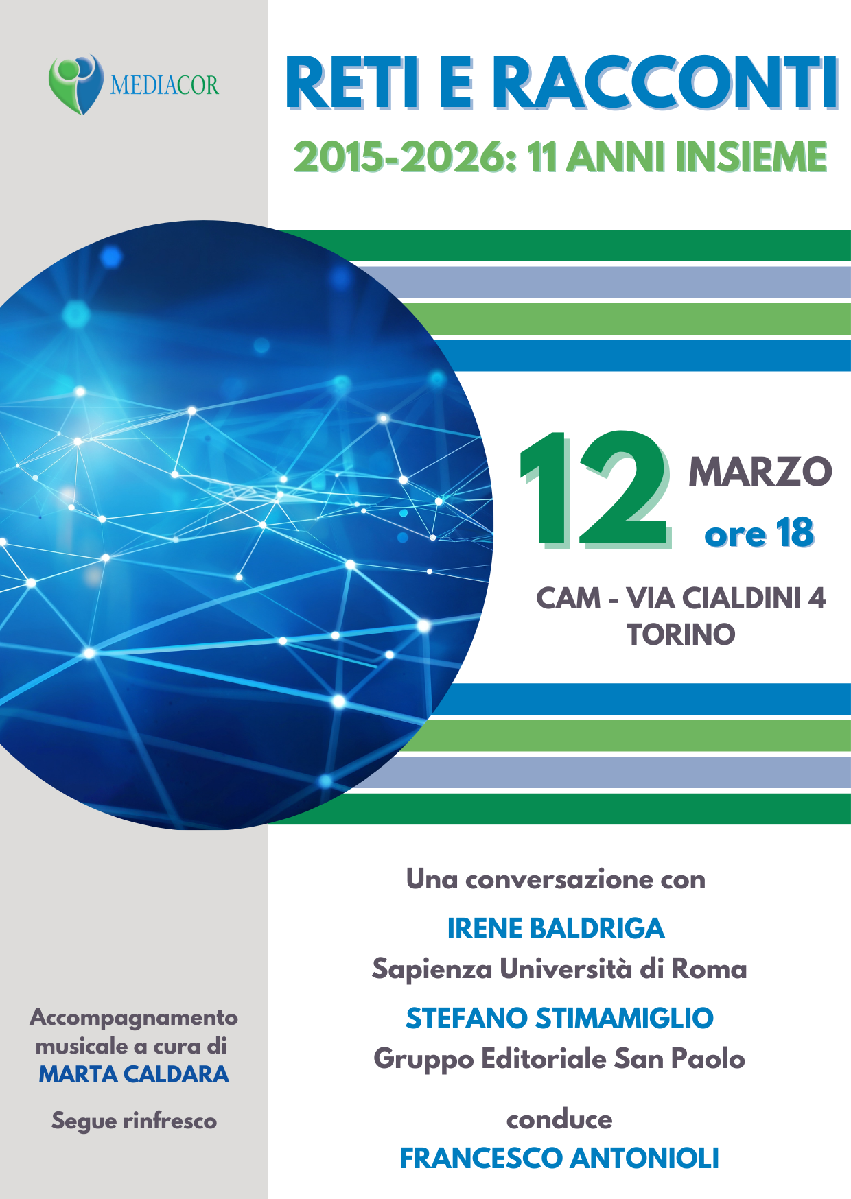 In occasione degli 11 anni di fondazione di Mediacor, il 12 marzo alle 18 al Polo Culturale “Cultures And Mission” in via Cialdini 4 a Torino si svolgerà in un evento per riflettere insieme su “Reti e racconti” come luoghi e linguaggi della comunicazione contemporanea, insieme a Irene Baldriga (docente presso La Sapienza Università di Roma) e don Stefano Stimamiglio (direttore di Famiglia Cristiana e Amministratore Delegato del Gruppo Editoriale San Paolo), con la conduzione del giornalista Francesco Antonioli. La conferenza si potrà seguire anche in streaming sul canale Youtube del CAM.